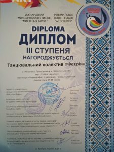 Танцювальний колектив «Феєрія» КЗ «Яблунівська спеціалізована школа – інтернат І – ІІІ ступенів з поглибленим вивченням окремих предметів та курсів» здобув ІIIмісце в номінації «Народний танець /колективи/».